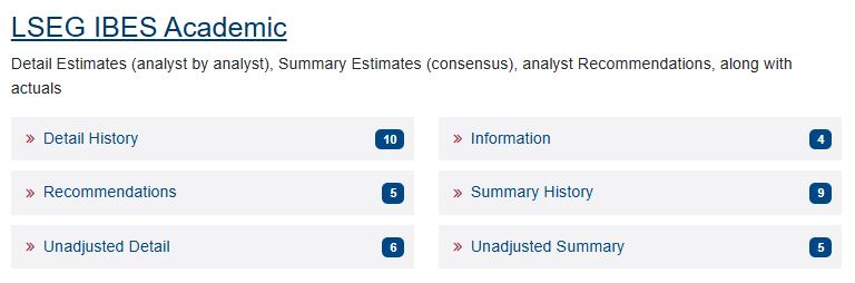 作为历史盈利预测数据库,它涵盖 20 余项预测指标的分析师预测数据 —— 包括每股收益(EPS)、营业收入、目标股价、息税折旧摊销前利润(EBITDA)及税前利润等,提供共识预测与明细层面数据,覆盖美国及全球范围内的上市公司。该数据库同时包含买入 - 持有 - 卖出评级建议。