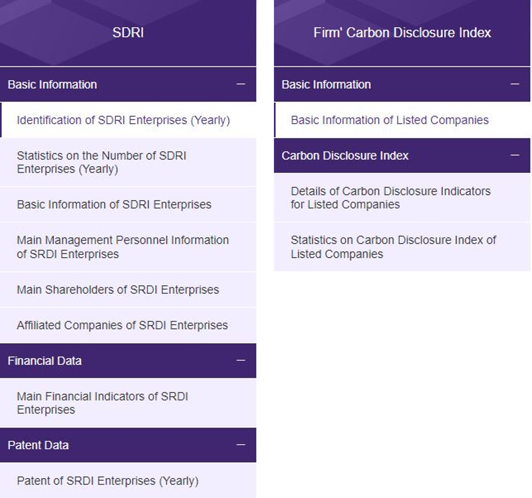 - SDRI (Specialized, Refined, Differentiated and Innovative): It belongs to the "Monographic Study" Series, which includes a list of innovative small and medium-sized enterprises, specialized, refined, and new small and medium-sized enterprises, and specialized, refined, and new "little giant" enterprises that have been officially recognized nationwide. It provides basic information, key management information, major shareholder information, subsidiary company information, major financial indicators, and patent application information for these enterprises.