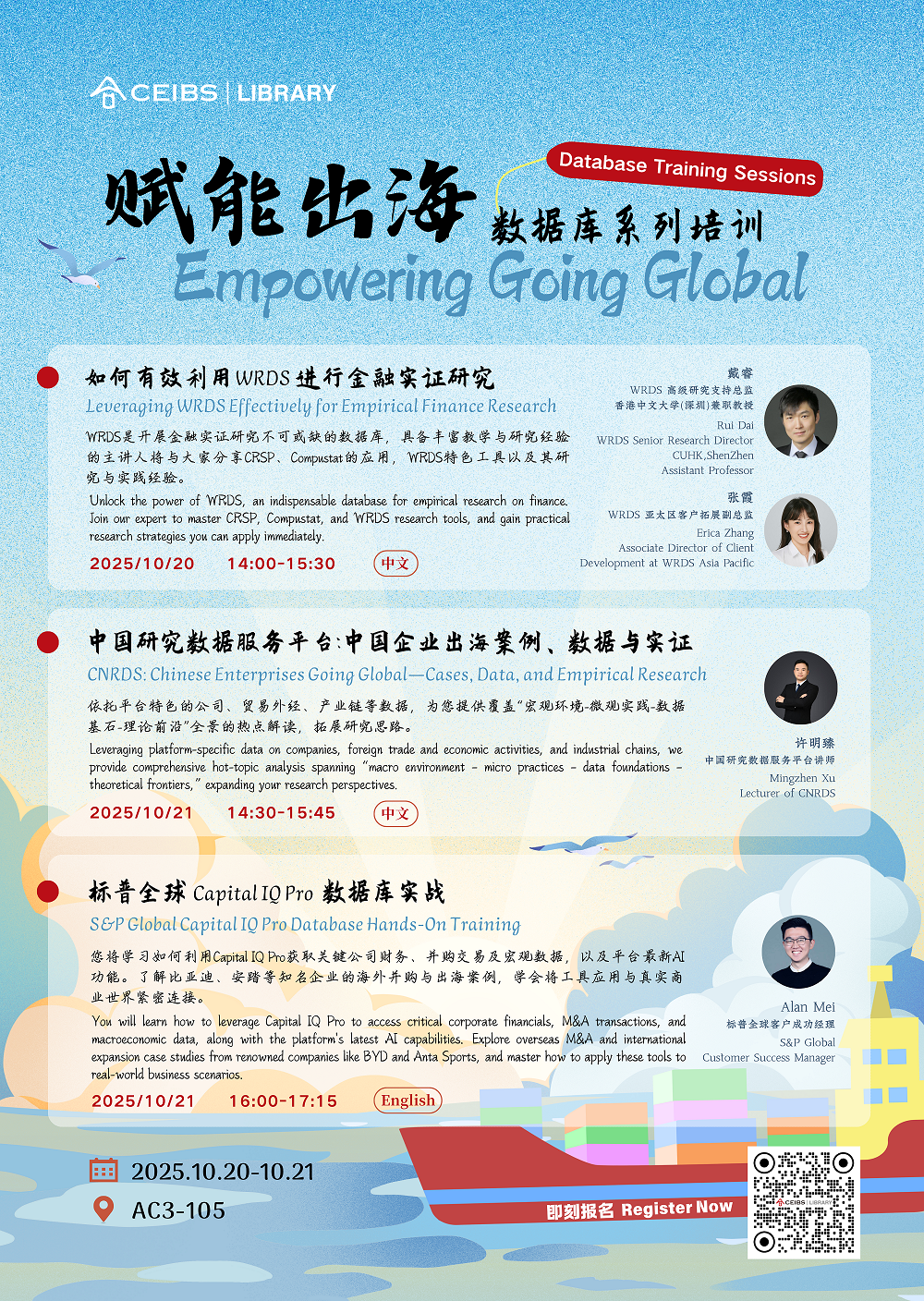 In the wave of "Going Global", how can researchers and practitioners leverage reliable data to gain market insights and analyze corporate internationalization strategies? To this end, the library is launching the "Empowering Global Expansion" Database Training Sessions, introducing specialized databases and research methodologies to provide you with the key to unlocking these insights.